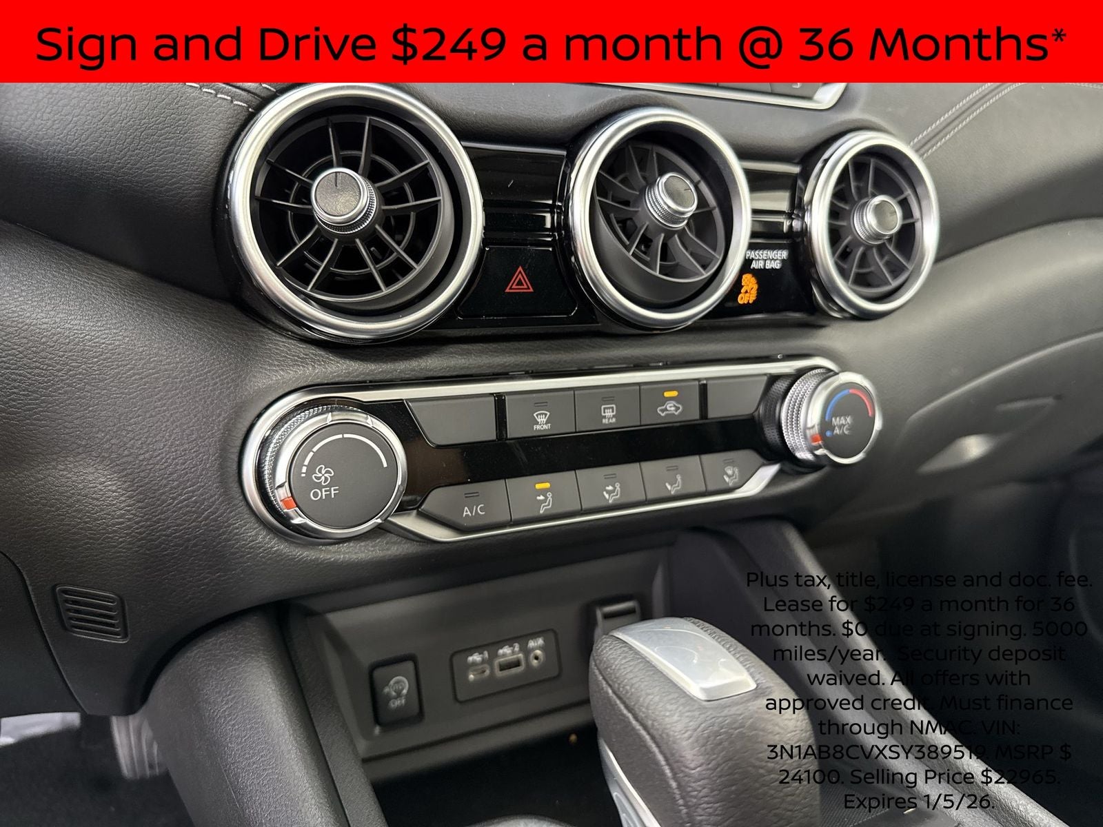 All prices exclude estimated taxes, title, licensing, and some dealer fees. Payments include $358 dealer fee and $695 lease acquisition fee. Available to well-qualified lessees on approved credit by Nissan Motor Acceptance Corp. (NMAC). Not all lessees may qualify. Offer assumes 14.47% down payment or $3,807 due at signing. Cash due at signing includes $3,499 down payment and first month's lease payment of $308. Actual net capitalized cost $20,484. Total payments equal $12,012. At lease end, purchase for $13,299, plus any official fees and taxes related to the scheduled termination and excess wear and use. Please see dealer for details. Offer expires 2/2/2026 12:00:00 AM.