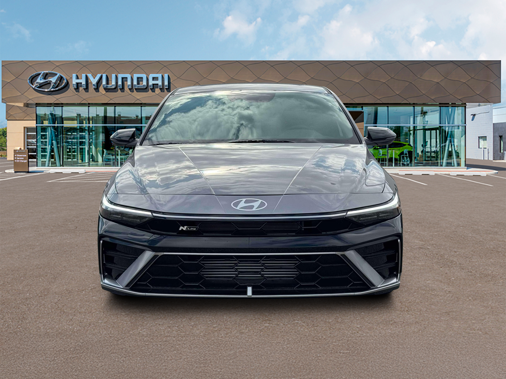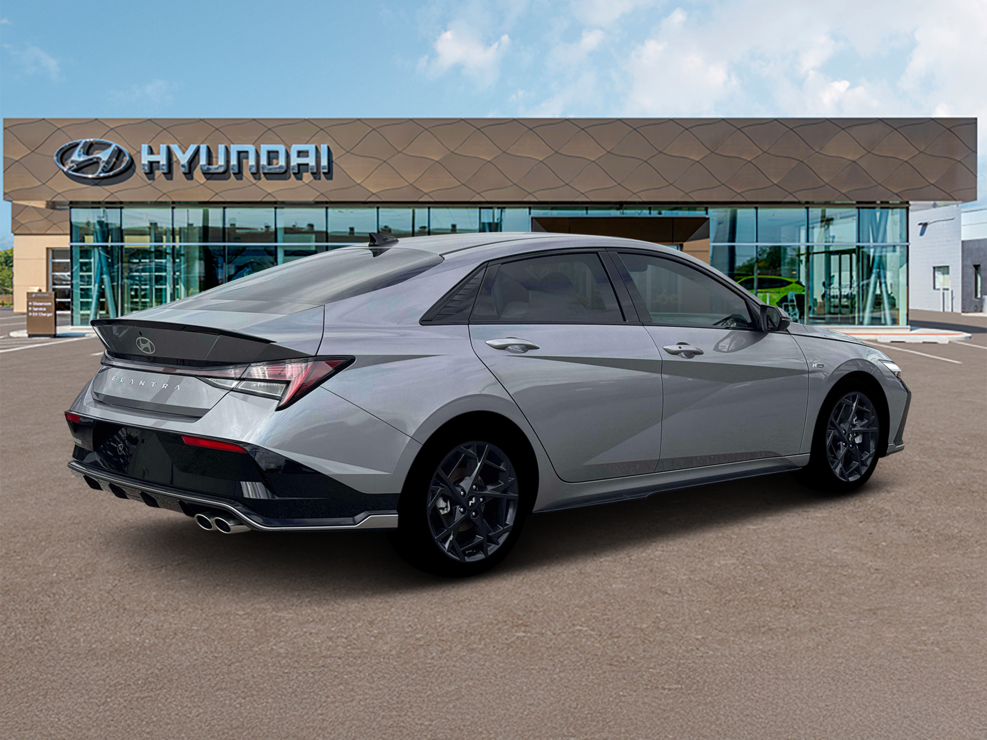 Elantra N Line is nicely equipped with Elantra N Line, 4D Sedan, I4, 7-Speed Dual Clutch DCT, FWD, Fluid Metal, Black Cloth, 4-Wheel Disc Brakes, 8 Speakers, ABS brakes, Air Conditioning, Alloy wheels, AM/FM radio: SiriusXM, Apple CarPlay & Android Auto, Auto High-beam Headlights, Automatic temperature control, Brake assist, Delay-off headlights, Driver door bin, Driver vanity mirror, Dual front impact airbags, Dual front side impact airbags, Electronic Stability Control, Exterior Parking Camera Rear, Four wheel independent suspension, Front anti-roll bar, Front Bucket Seats, Front dual zone A/C, Front reading lights, Fully automatic headlights, Heated door mirrors, Heated front seats, Illuminated entry, Leather Shift Knob, Leather steering wheel, Low tire pressure warning, Navigation System, Occupant sensing airbag, Outside temperature display, Overhead airbag, Overhead console, Panic alarm, Passenger door bin, Passenger vanity mirror, Power door mirrors, Power driver seat, Power moonroof, Power steering, Power windows, Rear anti-roll bar, Rear side impact airbag, Rear window defroster, Remote keyless entry, Security system, Speed control, Speed-sensing steering, Split folding rear seat, Spoiler, Sport steering wheel, Steering wheel mounted audio controls, Tachometer, Telescoping steering wheel, Tilt steering wheel, Traction control, Trip computer, Turn signal indicator mirrors, and Variably intermittent wipers. FWD 7-Speed Dual Clutch DCT I4