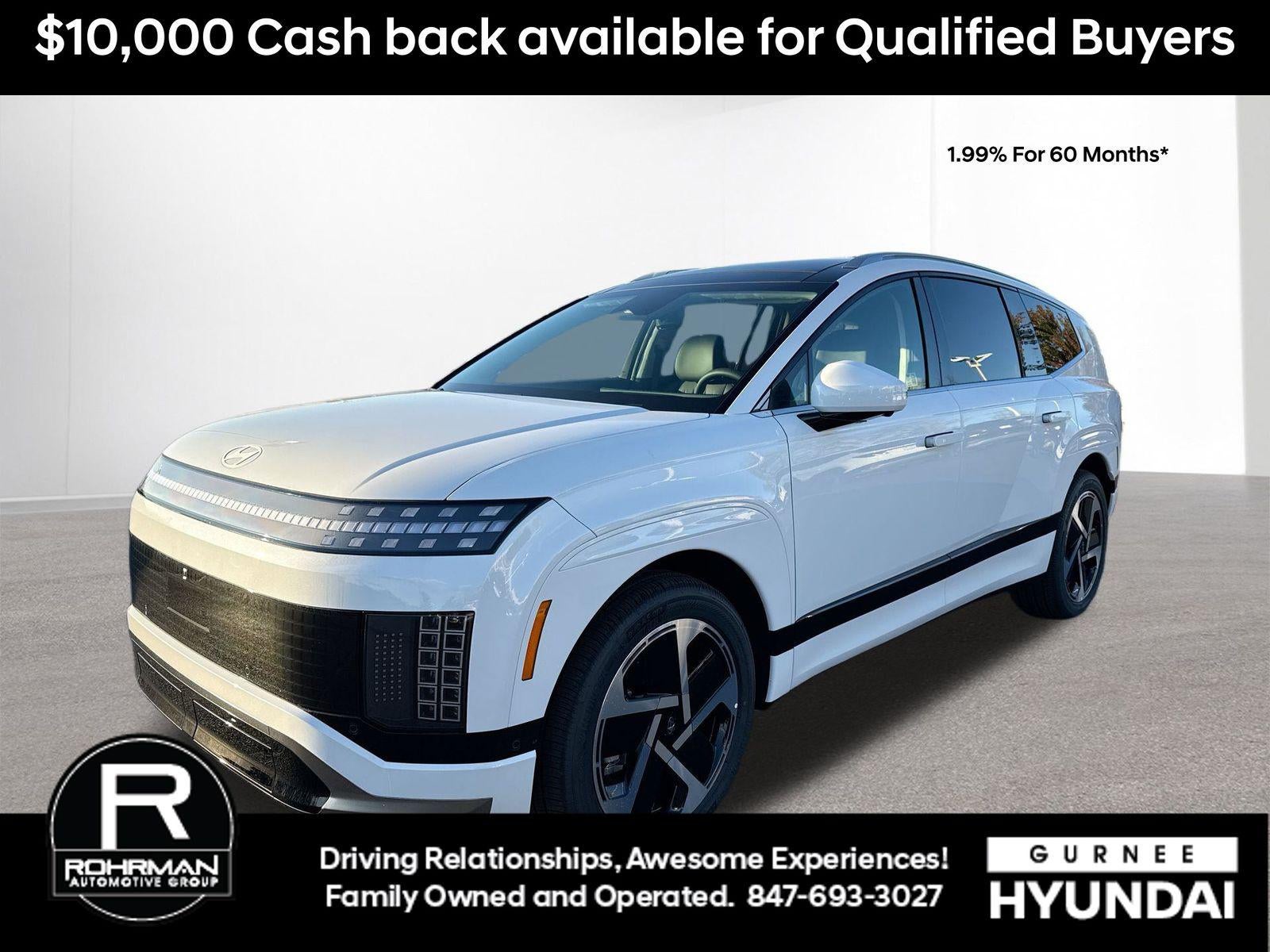 **ALL WHEEL DRIVE**, **PANORAMIC SUNROOF**, ** 7 PASSENGER**, **NAVIGATION**, **LEATHER SEATS**, **3RD ROW SEATS**, **PUSH BUTTON START**, **KEYLESS ENTRY**, **BACKUP CAMERA**, **Bluetooth®**, **HEATED STEERING WHEEL**, **RAIN SENSING WIPERS!**, **POWER LIFTGATE**, ** 8 PASSENGER **, **BLIND SPOT MONITOR**, **APPLE CARPLAY/ANDROID AUTO**, **ADAPTIVE CRUISE CONTROL**, PORTABLE AUDIO CONNECTION/MP3, **BOSE PREMIUM AUDIO**, Navigation System, Option Group 01. $10,336 off MSRP! Priced below KBB Fair Purchase Price! With options like Option Group 01, Navigation System, 14 Speakers, 4-Wheel Disc Brakes, ABS brakes, Air Conditioning, Alloy wheels, AM/FM radio: SiriusXM, Apple CarPlay & Android Auto, Auto High-beam Headlights, Auto-dimming Rear-View mirror, Auto-leveling suspension, Automatic temperature control, Bodyside moldings, Brake assist, Bumpers: body-color, Cargo Net, Cargo Organizer, Cargo Tray, Carpeted Floor Mats, Delay-off headlights, Driver door bin, Driver vanity mirror, Dual front impact airbags, Dual front side impact airbags, Electronic Stability Control, First Aid Kit, Four wheel independent suspension, Front anti-roll bar, Front Bucket Seats, Front Center Armrest, Front dual zone A/C, Front reading lights, Fully automatic headlights, Garage door transmitter: HomeLink, Heads-Up Display, Heated door mirrors, Heated front seats, Heated rear seats, Heated steering wheel, Illuminated entry, Leather steering wheel, Low tire pressure warning, Memory seat, Occupant sensing airbag, Outside temperature display, Overhead airbag, Overhead console, Panic alarm, Passenger door bin, Passenger vanity mirror, Power door mirrors, Power driver seat, Power Liftgate, Power moonroof: Panoramic, Power passenger seat, Power steering, Power windows, Premium Grade H-Tex Leatherette Seating Surfaces, Radio: AM/FM/SiriusXM/HD Audio System, Rain sensing wipers, Rear air conditioning, Rear anti-roll bar, Rear reading lights, Rear side impact airbag, Rear window defroster, Rear window wiper, Reclining 3rd row seat, Remote keyless entry, Security system, Speed control, Split folding rear seat, Spoiler, Steering wheel memory, Steering wheel mounted audio controls, Telescoping steering wheel, Tilt steering wheel, Traction control, Trip computer, Turn signal indicator mirrors, Variably intermittent wipers, Ventilated front seats, Ventilated rear seats, and Wheels: 21 x 9J 5-Spoke Alloy. Snow White Pearl 2026 Hyundai IONIQ 9 Performance Calligraphy AWD 1-Speed Automatic Electric Motor