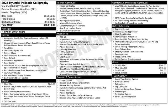 Palisade Calligraphy is nicely equipped with Option Group 01, Palisade Calligraphy, 4D Sport Utility, V6, 8-Speed Automatic, AWD, Ecotronic Gray Pearl, Gray/Navy Leather, 14 Speakers, 3rd row seats: split-bench, 4-Wheel Disc Brakes, ABS brakes, Air Conditioning, Alloy wheels, AM/FM radio: SiriusXM, Apple CarPlay & Android Auto, Audio memory, Auto High-beam Headlights, Auto-dimming door mirrors, Auto-dimming Rear-View mirror, Auto-leveling suspension, Automatic temperature control, Brake assist, Bumpers: body-color, Cargo Net, Cargo Tray, Carpeted Floor Mats, Compass, Delay-off headlights, Driver door bin, Driver vanity mirror, Dual front impact airbags, Dual front side impact airbags, Electronic Stability Control, Exterior Parking Camera Rear, First Aid Kit, Four wheel independent suspension, Front anti-roll bar, Front Bucket Seats, Front Center Armrest, Front dual zone A/C, Front reading lights, Fully automatic headlights, Garage door transmitter: HomeLink, Genuine wood console insert, Genuine wood dashboard insert, Heads-Up Display, Heated door mirrors, Heated front seats, Heated rear seats, Heated steering wheel, HVAC memory, Illuminated entry, Knee airbag, Leather steering wheel, Low tire pressure warning, Memory seat, Mud Guards, Navigation System, Occupant sensing airbag, Outside temperature display, Overhead airbag, Overhead console, Panic alarm, Passenger door bin, Passenger vanity mirror, Power door mirrors, Power driver seat, Power Liftgate, Power moonroof, Power passenger seat, Power steering, Power windows, Premium Nappa Leather Seat Trim, Radio data system, Radio: Infotainment Navigation System, Rain sensing wipers, Rear air conditioning, Rear anti-roll bar, Rear audio controls, Rear reading lights, Rear side impact airbag, Rear window defroster, Rear window wiper, Reclining 3rd row seat, Remote keyless entry, Security system, Speed control, Split folding rear seat, Spoiler, Steering wheel mounted audio controls, Tachometer, Telescoping steering wheel, Tilt steering wheel, Traction control, Trip computer, Turn signal indicator mirrors, Variably intermittent wipers, Ventilated front seats, Ventilated rear seats, and Wheels: 21 x 8.5J Alloy. AWD 8-Speed Automatic V6