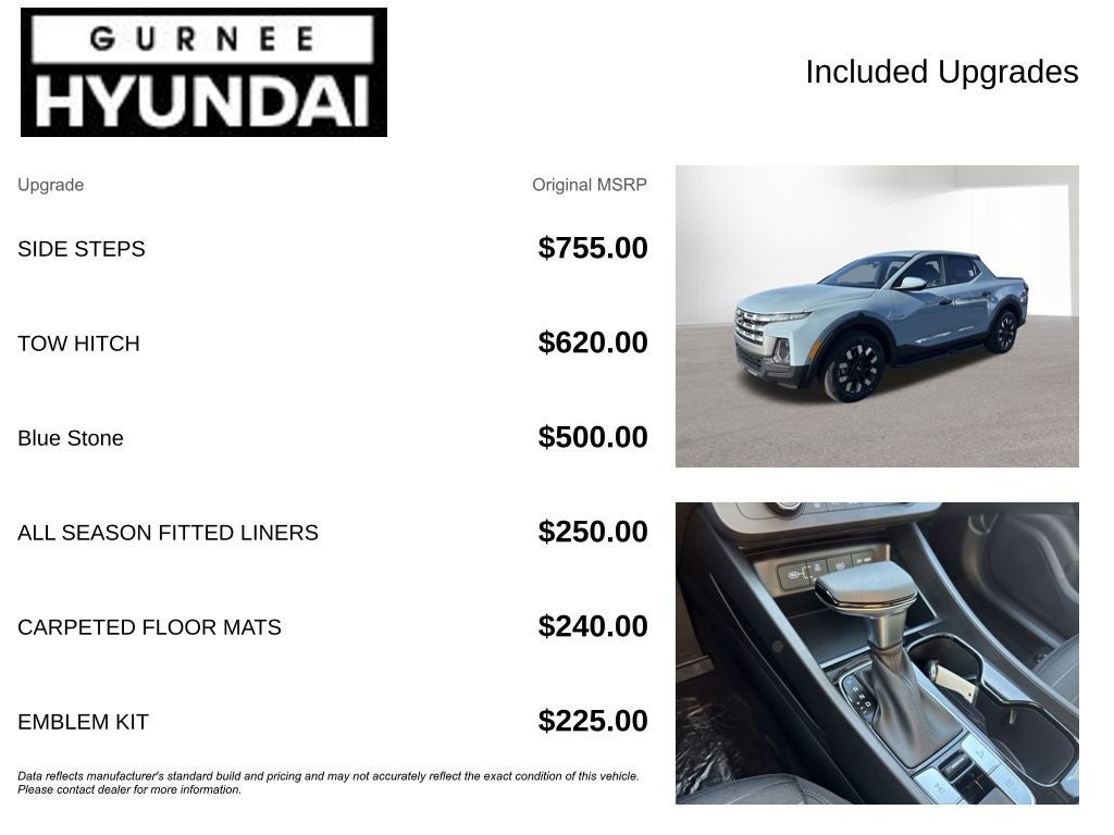 **All prices do not include tax, title, license and Illinois documentation fee. All offers with approved credit. Sale pricing includes all Volkswagen rebates and incentives applicable to everyone. Additional Dealer Exclusive savings may be available. See dealer for details. **Dealer installed items may not be updated in price, please check with dealer for details. All prices, specifications and availability are subject to change without notice. We reserve the right to modify this quote to correct arithmetic errors. Incentive and pricing programs are subject to change by Gurnee Volkswagen without notice. While every reasonable effort is made to ensure the accuracy of this information, we are not responsible for any errors or omissions contained on websites. Prices subject to change at any time due to fluctuation in retail automotive market conditions. Contact us for the most up to date pricing.** *Sale price does not include taxes, license, title fees, dealer installed accessories, and a documentary service fee as permitted by law or regulation. Sale pricing includes all Hyundai rebates and incentives applicable to everyone. Additional Dealer Exclusive savings may be available. See dealer for details. All prices, specifications and availability are subject to change without notice. We reserve the right to modify this quote to correct arithmetic errors. Incentive and pricing programs are subject to change by Hyundai without notice. Vehicle contained in this quote is subject to availability. Contact dealer for most current information$250 - Retail Bonus Cash. Exp. 03/02/2026
