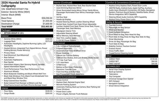 At our dealership, we are committed to providing you with an exceptional purchasing experience. Our knowledgeable team is here to guide you through every step, ensuring you find the perfect vehicle that aligns with your lifestyle and needs. Discover the true meaning of driving pleasure with the 2026 Hyundai Santa Fe Hybrid Calligraphy – a masterpiece of automotive engineering that will elevate your every journey. Price includes: $1500 - Hyundai HMF Dealer Choice : $1500 discount and 5.39% APR for 24 months. $44.05 per $1000 financed. Available to well qualified buyers who finance through Hyundai Motor Finance. H704. Exp. 02/02/2026
