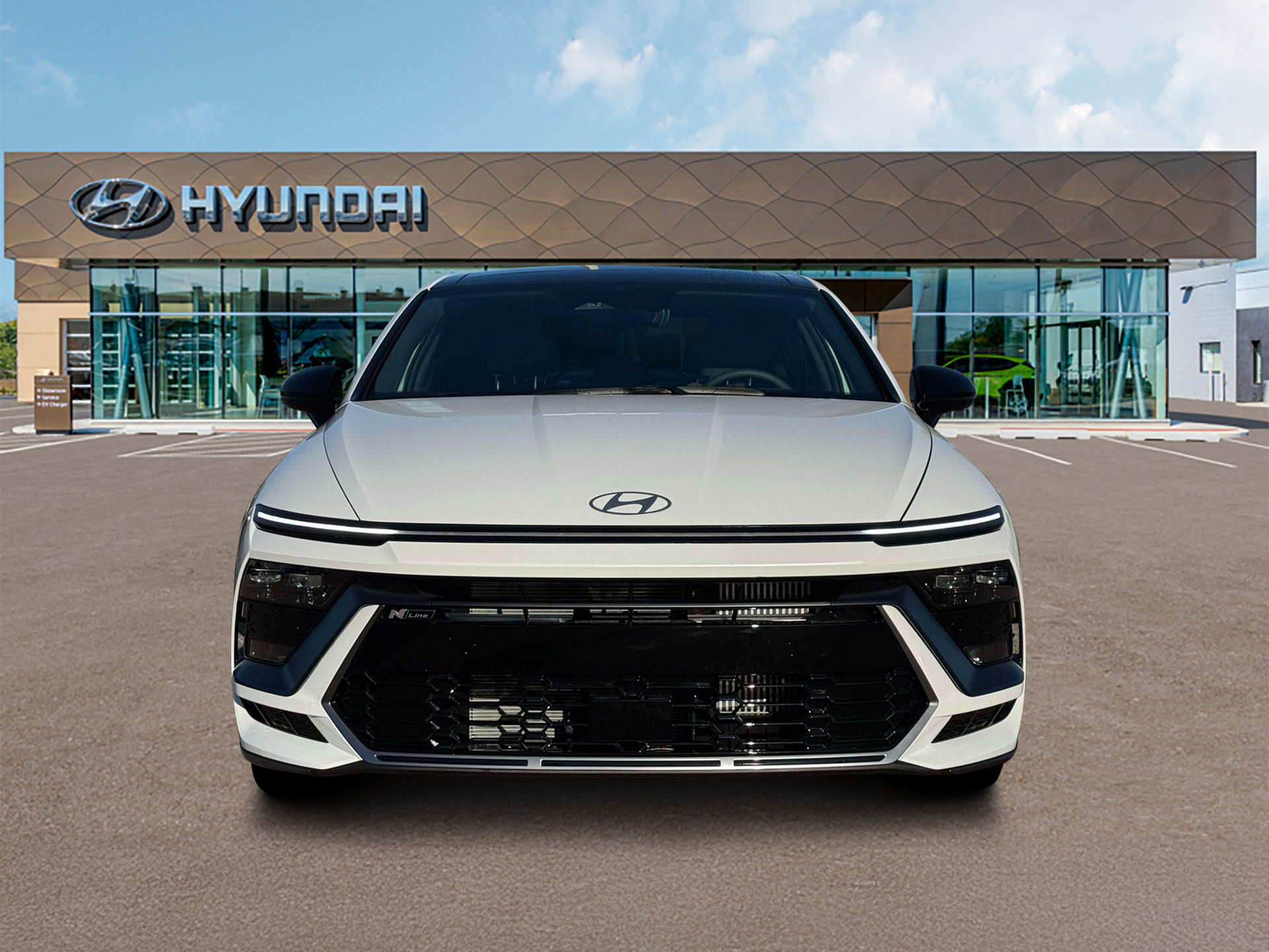 Sonata N Line is nicely equipped with Option Group 01, Sonata N Line, 4D Sedan, I4, 8-Speed, FWD, Serenity White, Dark Gray Premium Synthetic, 12 Speakers, 19 x 8.0J Aluminum Alloy Wheels, 4-Wheel Disc Brakes, ABS brakes, Air Conditioning, Alloy wheels, AM/FM radio: SiriusXM, Apple CarPlay & Android Auto, Auto High-beam Headlights, Auto-dimming Rear-View mirror, Automatic temperature control, Brake assist, Bumpers: body-color, Cargo Side Bins, Cargo Tray, Carpeted Floor Mats, Delay-off headlights, Driver door bin, Driver vanity mirror, Dual front impact airbags, Dual front side impact airbags, Electronic Stability Control, Exterior Parking Camera Rear, Four wheel independent suspension, Front anti-roll bar, Front Bucket Seats, Front Center Armrest, Front dual zone A/C, Front reading lights, Fully automatic headlights, Heated door mirrors, Heated front seats, Heated N Unique Sport Seats, Illuminated entry, Knee airbag, Leather steering wheel, Leatherette/Suede Combination Seating Surfaces, Low tire pressure warning, Navigation System, Occupant sensing airbag, Outside temperature display, Overhead airbag, Overhead console, Panic alarm, Passenger door bin, Passenger vanity mirror, Power door mirrors, Power driver seat, Power moonroof, Power steering, Power windows, Radio data system, Rear anti-roll bar, Rear seat center armrest, Rear side impact airbag, Rear window defroster, Remote keyless entry, Security system, Speed control, Speed-sensing steering, Speed-Sensitive Wipers, Split folding rear seat, Spoiler, Sport steering wheel, Steering wheel mounted audio controls, Tachometer, Telescoping steering wheel, Tilt steering wheel, Traction control, Trip computer, and Variably intermittent wipers. FWD 8-Speed I4