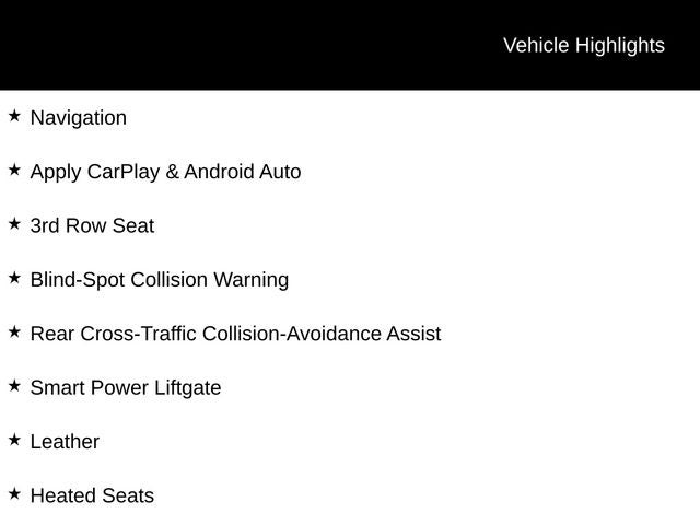 Navigation, Apply CarPlay & Android Auto, 3rd Row Seat, Blind-Spot Collision Warning, Rear Cross-Traffic Collision-Avoidance Assist, Smart Power Liftgate, Leather, Heated Seats, Remote Start, Bluetooth®, Backup Camera, Smart Cruise Control w/Stop & Go, Lane Following Assist, Forward Collision Avoidance, High Beam Assist, Highway Driving Assist, Lane Keep Assist, Push Button Smart with Smart Key, Kia Connect with 3 years free, Front and Rear USB Ports, SIRIUSXM Radio.