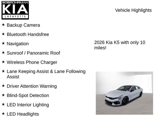 Price does not include tax, title, license, registration, or dealer installed options. Price Includes :$1250 - KFA Dealer Choice Program: $1250 discount and 5.25% APR for 36 months. $30.08 per $1000 financed. Available to well qualified buyers who finance through Kia Finance America. 506. Exp. 05/04/2026 Discover the perfect blend of style, performance, and technology in the 2026 Kia K5 GT-Line. This captivating sedan is designed to elevate your driving experience and turn heads wherever you go.