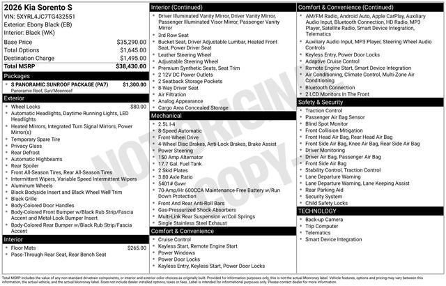 Elevate your driving experience with the 2026 Kia Sorento S. This exceptional SUV combines style, comfort, and capability, making it the perfect companion for your adventures. Visit our showroom today and experience the Sorento S for yourself. We're confident you'll be impressed by its exceptional value and the exceptional customer service you'll receive from our team. Price includes all applicable rebates and incentives. Price does not include dealer added addendums. Price does not include tax, title, license, or document fees. Customer must qualify for all Incentives.$2500 - Kia Customer Cash. Exp. 05/04/2026