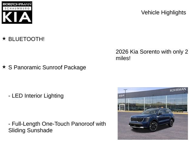 Don't settle for anything less than the best. Experience the 2026 Kia Sorento S and discover the perfect companion for your adventures. Visit our showroom today and let us help you find the perfect SUV to fit your lifestyle. Price includes all applicable rebates and incentives. Price does not include dealer added addendums. Price does not include tax, title, license, or document fees. Customer must qualify for all Incentives.$2500 - Kia Customer Cash. Exp. 03/31/2026