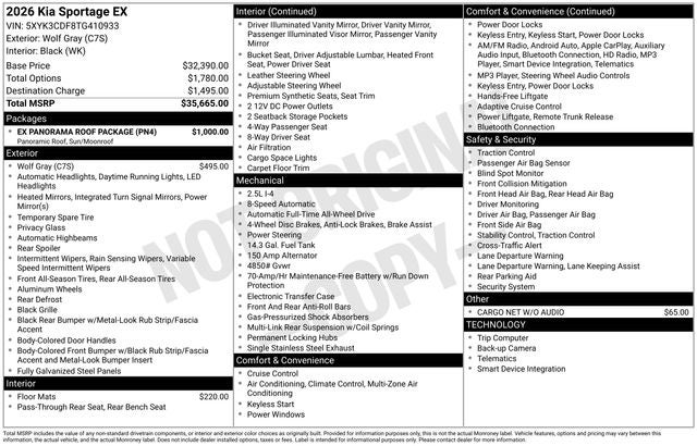 Price does not include tax, title, license, registration, or dealer installed options. Price Includes :$1500 - KFA Dealer Choice Program: $1500 discount and 5.25% APR for 36 months. $30.08 per $1000 financed. Available to well qualified buyers who finance through Kia Finance America. 506. Exp. 05/04/2026 Dealer Discount of $1,107 off MSRP Wolf Gray 2026 Kia Sportage EX 4D Sport Utility AWD I4 8-Speed Automatic 23/26 City/Highway MPG AWD/4WD, Backup Camera, Bluetooth® Handsfree, Sunroof / Panoramic Roof, Wireless Phone Charger, Lane Keeping Assist & Lane Following Assist, Driver Attention Warning, Blind-Spot Detection, LED Interior Lighting, LED Headlights, Android Auto and Apple CarPlay, blue tooth, 18 x 7.5J Alloy Wheels, 4-Wheel Disc Brakes, 6 Speakers, ABS brakes, Active Cruise Control, Air Conditioning, All Weather Mats, Alloy wheels, Auto High-beam Headlights, Automatic temperature control, Brake assist, Bumpers: body-color, Cargo Net Without Audio, Delay-off headlights, Driver door bin, Driver vanity mirror, Dual front impact airbags, Dual front side impact airbags, Electronic Stability Control, Emergency communication system: Kia Connect (includes 1 year free trial), EX Panorama Roof Package, Four wheel independent suspension, Front anti-roll bar, Front Bucket Seats, Front Center Armrest, Front dual zone A/C, Fully automatic headlights, Heated door mirrors, Heated Front Bucket Seats, Heated front seats, Illuminated entry, Leather Shift Knob, Leather steering wheel, LED Interior Lighting, Low tire pressure warning, Occupant sensing airbag, Outside temperature display, Overhead airbag, Overhead console, Panic alarm, Panoramic Sunroof, Passenger door bin, Passenger vanity mirror, Power door mirrors, Power driver seat, Power Liftgate, Power steering, Power windows, Radio: AM/FM/HD Audio System, Rain sensing wipers, Rear anti-roll bar, Rear seat center armrest, Rear side impact airbag, Rear window defroster, Rear window wiper, Remote keyless entry, Security system, Speed control, Speed-sensing steering, Split folding rear seat, Spoiler, Steering wheel mounted audio controls, Syntex Leatherette Seat Trim, Tachometer, Telescoping steering wheel, Tilt steering wheel, Traction control, Trip computer, Turn signal indicator mirrors, Variably intermittent wipers. Internet price reflects all qualifying rebates and discounts. Customer must qualify, see dealer for details (765)250-5220.
