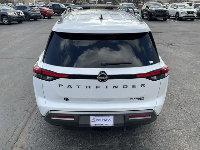 Pathfinder Platinum is nicely equipped with Cargo Package (Cargo Area Protector, Cargo Net, and First Aid), 4WD, 13 Speakers, 3rd row seats: bench, 4-Piece Black Splash Guards, 4-Wheel Disc Brakes, ABS brakes, Air Conditioning, Alloy wheels, AM/FM radio: SiriusXM w/360L, Auto High-beam Headlights, Auto tilt-away steering wheel, Auto-dimming Rear-View mirror, Automatic temperature control, Bench Seat Carpeted Floor Mats, Bodyside moldings, Bose Premium Audio System, Brake assist, Bumpers: body-color, Climate Controlled Front Bucket Seats, Cross Bars, Delay-off headlights, Driver door bin, Driver vanity mirror, Dual front impact airbags, Dual front side impact airbags, Electronic Stability Control, Emergency communication system: NissanConnect Services, Four wheel independent suspension, Front anti-roll bar, Front Bucket Seats, Front Center Armrest, Front dual zone A/C, Front reading lights, Fully automatic headlights, Garage door transmitter: HomeLink, Heads-Up Display, Heated door mirrors, Heated front seats, Heated rear seats, Heated steering wheel, Illuminated entry, Knee airbag, Low tire pressure warning, Memory seat, NissanConnect featuring Apple CarPlay and Android Auto, Occupant sensing airbag, Outside temperature display, Overhead airbag, Overhead console, Panic alarm, Passenger door bin, Passenger vanity mirror, Power door mirrors, Power driver seat, Power Liftgate, Power moonroof, Power passenger seat, Power steering, Power windows, Premium Paint, Radio data system, Radio: AM/FM Audio System with NissanConnect, Rain sensing wipers, Rear air conditioning, Rear anti-roll bar, Rear reading lights, Rear seat center armrest, Rear side impact airbag, Rear window defroster, Rear window wiper, Reclining 3rd row seat, Remote keyless entry, Security system, Semi-Aniline Leather-Appointed Seating Surfaces, Speed control, Speed-sensing steering, Speed-Sensitive Wipers, Split folding rear seat, Spoiler, Steering wheel memory, Steering wheel mounted audio controls, Tachometer, Telescoping steering wheel, Tilt steering wheel, Traction control, Trip computer, Turn signal indicator mirrors, Variably intermittent wipers, Ventilated front seats, and Wheels: 20 Machined Alloy.
