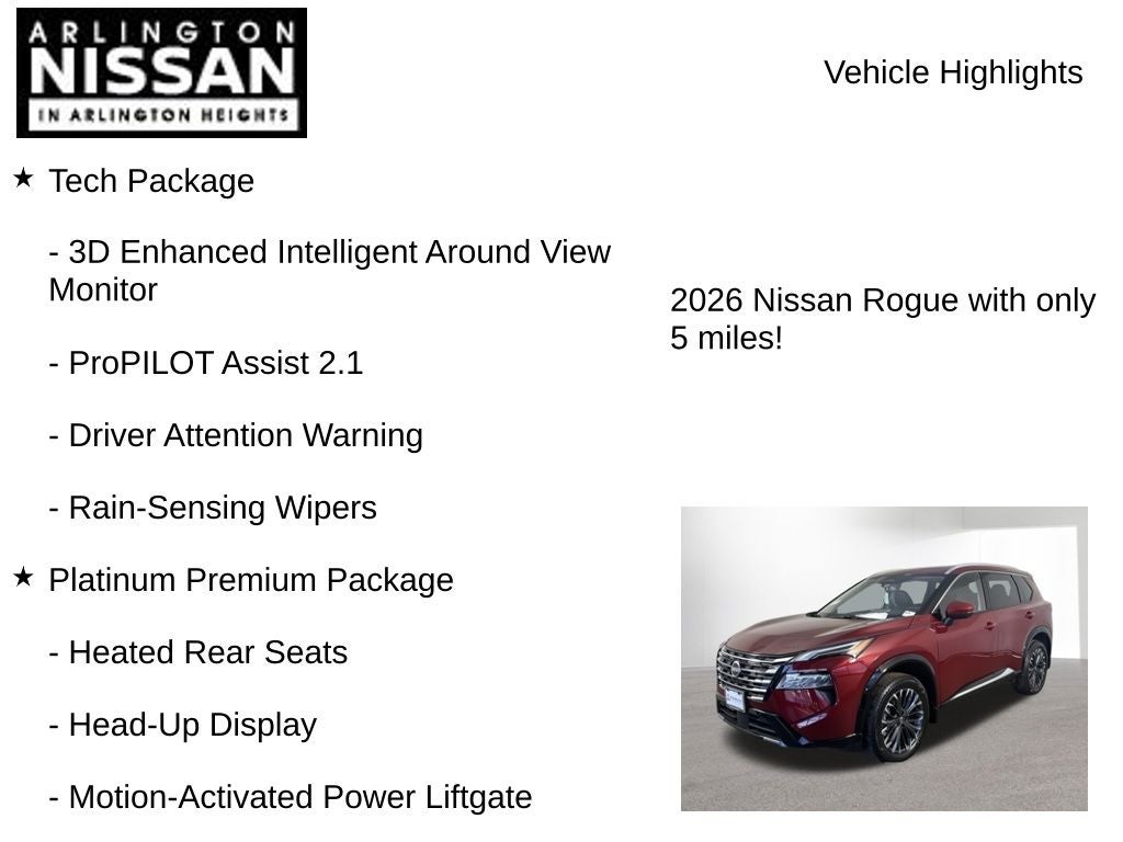Discover the perfect balance of style, technology, and performance in the 2026 Nissan Rogue Platinum. Experience the difference for yourself by scheduling a test drive at our dealership today. We're confident that once you take the wheel, you'll be captivated by the exceptional driving dynamics and premium features that make this Rogue Platinum a true standout in its class. Price includes: $3500 - Nissan Customer Cash. Exp. 03/31/2026