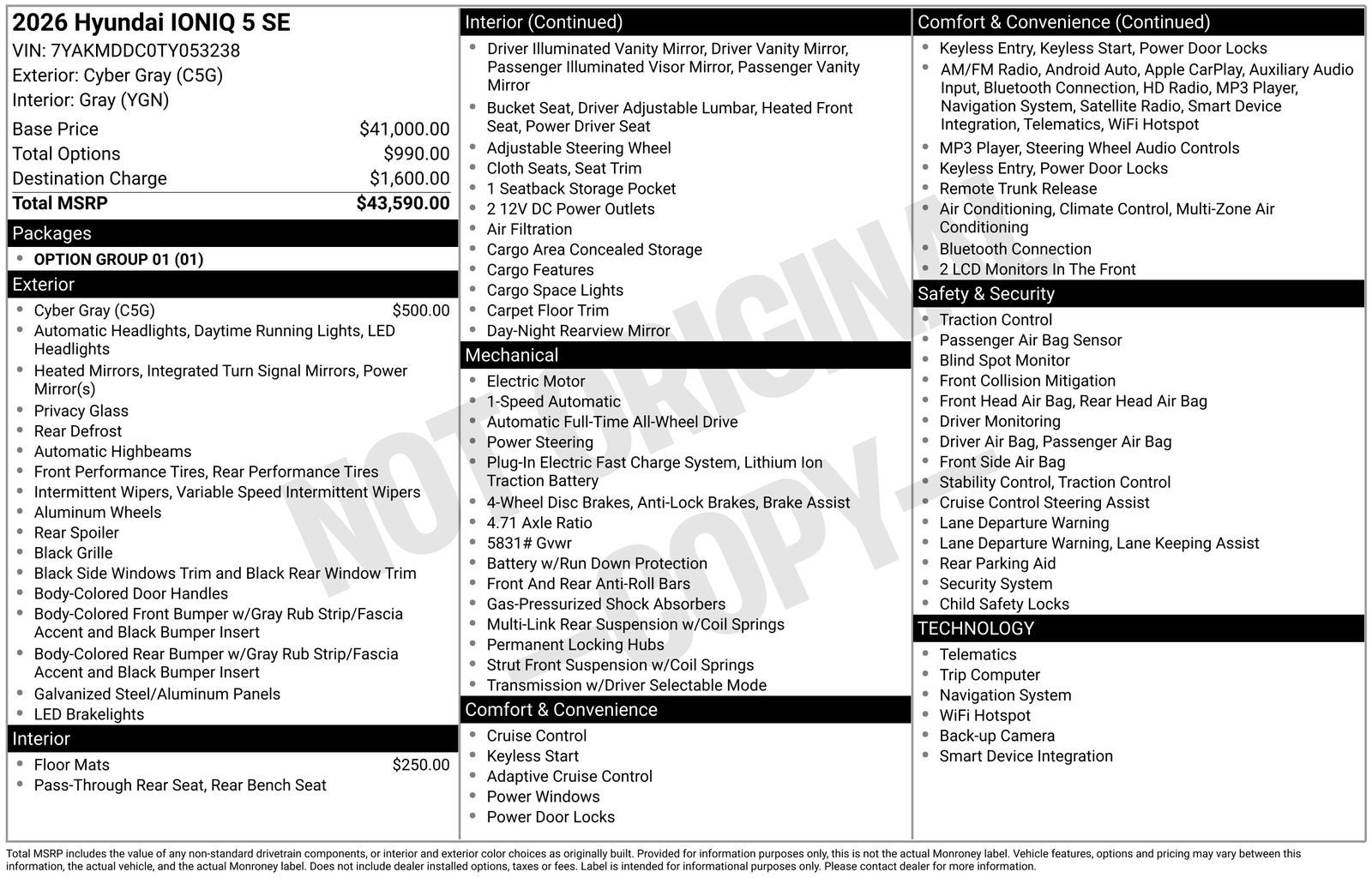 **ALL WHEEL DRIVE**, **NAVIGATION**, **PUSH BUTTON START**, **KEYLESS ENTRY**, **BACKUP CAMERA**, **Bluetooth®**, **REMOTE START**, **BLIND SPOT MONITOR**, **APPLE CARPLAY/ANDROID AUTO**, **ADAPTIVE CRUISE CONTROL**, PORTABLE AUDIO CONNECTION/MP3. $6,319 off MSRP! Priced below KBB Fair Purchase Price! With options like Option Group 01, 4-Wheel Disc Brakes, 6 Speakers, ABS brakes, Air Conditioning, Alloy wheels, AM/FM radio: SiriusXM, Apple CarPlay & Android Auto, Auto High-beam Headlights, Automatic temperature control, Bodyside moldings, Brake assist, Bumpers: body-color, Carpeted Floor Mats, Delay-off headlights, Driver door bin, Driver vanity mirror, Dual front impact airbags, Dual front side impact airbags, Electronic Stability Control, Emergency communication system: None, Four wheel independent suspension, Front anti-roll bar, Front Bucket Seats, Front Center Armrest w/Storage, Front dual zone A/C, Front reading lights, Fully automatic headlights, harman/kardon® Speakers, Heated door mirrors, Heated Front Bucket Seats, Heated front seats, Illuminated entry, Low tire pressure warning, Navigation System, Occupant sensing airbag, Outside temperature display, Overhead airbag, Overhead console, Panic alarm, Passenger door bin, Passenger vanity mirror, Power door mirrors, Power driver seat, Power steering, Power windows, Radio: AM/FM/SiriusXM/HD Audio System, Rear anti-roll bar, Rear reading lights, Rear seat center armrest, Rear side impact airbag, Rear window defroster, Rear window wiper, Remote keyless entry, Security system, Speed control, Speed-sensing steering, Split folding rear seat, Spoiler, Stain-Resistant Cloth Seating Surfaces, Steering wheel mounted audio controls, Telescoping steering wheel, Tilt steering wheel, Traction control, Trip computer, Turn signal indicator mirrors, Variably intermittent wipers, and Wheels: 19 x 7.5J Alloy. Cyber Gray 2026 Hyundai IONIQ 5 SE AWD 1-Speed Automatic Electric Motor