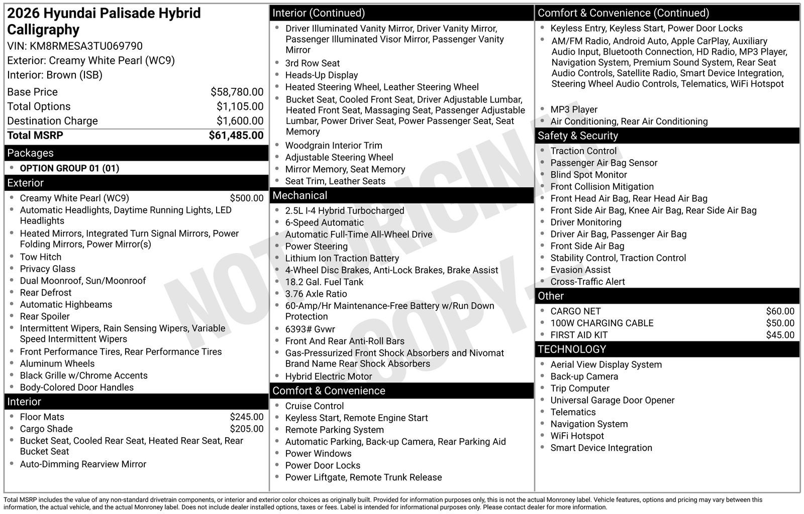 **ALL WHEEL DRIVE**, **SUNROOF/MOONROOF**, ** 7 PASSENGER**, **NAVIGATION**, **LEATHER SEATS**, **3RD ROW SEATS**, **PUSH BUTTON START**, **KEYLESS ENTRY**, **BACKUP CAMERA**, **Bluetooth®**, **HEATED STEERING WHEEL**, **RAIN SENSING WIPERS!**, **POWER LIFTGATE**, **REMOTE START**, **BLIND SPOT MONITOR**, **APPLE CARPLAY/ANDROID AUTO**, **ADAPTIVE CRUISE CONTROL**, PORTABLE AUDIO CONNECTION/MP3, **BOSE PREMIUM AUDIO**, Navigation System, Option Group 01. With options like Option Group 01, Navigation System, 100W Charging Cable, 14 Speakers, 3rd row seats: split-bench, 4-Wheel Disc Brakes, ABS brakes, Air Conditioning, Alloy wheels, AM/FM radio: SiriusXM, Apple CarPlay & Android Auto, Audio memory, Auto High-beam Headlights, Auto-dimming door mirrors, Auto-dimming Rear-View mirror, Auto-leveling suspension, Automatic temperature control, Brake assist, Bumpers: body-color, Cargo Cover, Cargo Net, Carpeted Floor Mats, Compass, Delay-off headlights, Driver door bin, Driver vanity mirror, Dual front impact airbags, Dual front side impact airbags, Electronic Stability Control, Emergency communication system: None, Exterior Parking Camera Rear, First Aid Kit, Four wheel independent suspension, Front anti-roll bar, Front Bucket Seats, Front Center Armrest, Front dual zone A/C, Front reading lights, Fully automatic headlights, Garage door transmitter: HomeLink, Genuine wood console insert, Genuine wood dashboard insert, Heads-Up Display, Heated and Ventilated Front Bucket Seats, Heated door mirrors, Heated front seats, Heated rear seats, Heated steering wheel, HVAC memory, Illuminated entry, Knee airbag, Leather steering wheel, Low tire pressure warning, Memory seat, Occupant sensing airbag, Outside temperature display, Overhead airbag, Overhead console, Panic alarm, Passenger door bin, Passenger vanity mirror, Power door mirrors, Power driver seat, Power Liftgate, Power moonroof, Power passenger seat, Power steering, Power windows, Premium Nappa Leather Seat Trim, Radio data system, Radio: Infotainment Navigation System, Rain sensing wipers, Rear air conditioning, Rear anti-roll bar, Rear audio controls, Rear reading lights, Rear side impact airbag, Rear window defroster, Rear window wiper, Reclining 3rd row seat, Remote keyless entry, Security system, Speed control, Split folding rear seat, Spoiler, Steering wheel mounted audio controls, Tachometer, Telescoping steering wheel, Tilt steering wheel, Traction control, Trip computer, Turn signal indicator mirrors, Variably intermittent wipers, Ventilated front seats, Ventilated rear seats, and Wheels: 21 x 8.5J Alloy. Creamy White Pearl 2026 Hyundai Palisade Hybrid Calligraphy AWD 6-Speed Automatic 2.5L Turbocharged GDI 4-Cylinder Hybrid