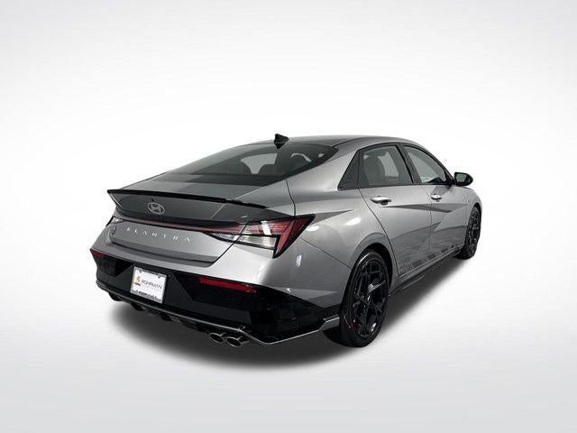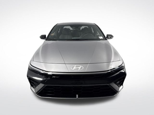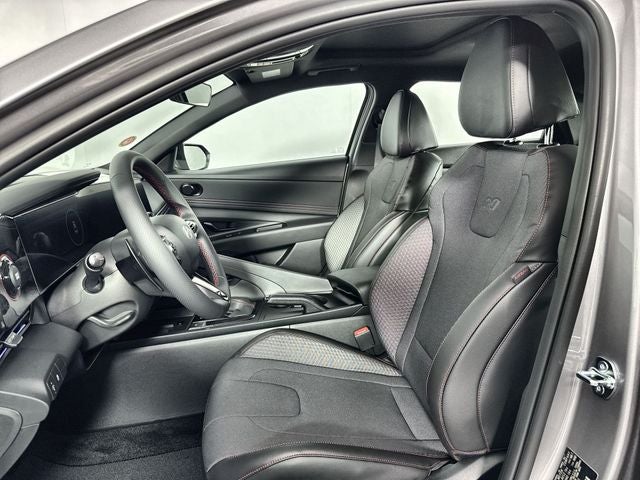 Elantra N Line is nicely equipped with Elantra N Line, 4D Sedan, I4, 7-Speed Dual Clutch DCT, FWD, Fluid Metal, Black Cloth, 4-Wheel Disc Brakes, 8 Speakers, ABS brakes, Air Conditioning, Alloy wheels, AM/FM radio: SiriusXM, Apple CarPlay & Android Auto, Auto High-beam Headlights, Automatic temperature control, Brake assist, Delay-off headlights, Driver door bin, Driver vanity mirror, Dual front impact airbags, Dual front side impact airbags, Electronic Stability Control, Exterior Parking Camera Rear, Four wheel independent suspension, Front anti-roll bar, Front Bucket Seats, Front dual zone A/C, Front reading lights, Fully automatic headlights, Heated door mirrors, Heated front seats, Illuminated entry, Leather Shift Knob, Leather steering wheel, Low tire pressure warning, Navigation System, Occupant sensing airbag, Outside temperature display, Overhead airbag, Overhead console, Panic alarm, Passenger door bin, Passenger vanity mirror, Power door mirrors, Power driver seat, Power moonroof, Power steering, Power windows, Rear anti-roll bar, Rear side impact airbag, Rear window defroster, Remote keyless entry, Security system, Speed control, Speed-sensing steering, Split folding rear seat, Spoiler, Sport steering wheel, Steering wheel mounted audio controls, Tachometer, Telescoping steering wheel, Tilt steering wheel, Traction control, Trip computer, Turn signal indicator mirrors, and Variably intermittent wipers. FWD 7-Speed Dual Clutch DCT I4