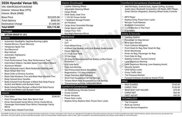 Discover the perfect balance of style, technology, and practicality in the 2026 Hyundai Venue SEL. With its impressive fuel efficiency, comprehensive safety suite, and array of premium amenities, this compact SUV is the ideal choice for those seeking a versatile and refined driving experience. Visit our showroom today and experience the Venue SEL for yourself – we're confident you'll be impressed. Price includes: $1,250 - Exp. 04/30/2026