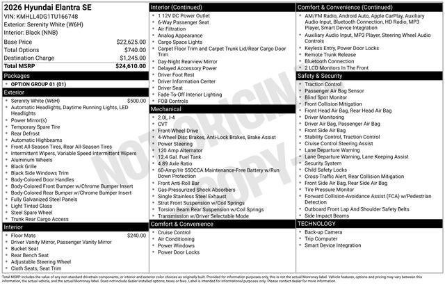 We invite you to visit our showroom and take the 2026 Hyundai Elantra SE for a test drive. Discover the perfect balance of style, technology, and performance that will exceed your expectations and leave a lasting impression. Let us help you find the perfect vehicle to complement your lifestyle. Price includes: $2000 - Hyundai HMF Dealer Choice : $2000 discount and 5.39% APR for 24 months. $44.05 per $1000 financed. Available to well qualified buyers who finance through Hyundai Motor Finance. H704. Exp. 04/30/2026