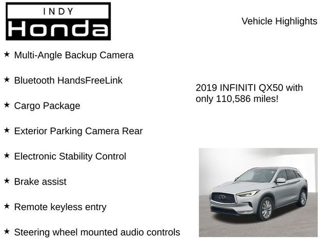 Discover the exceptional value and uncompromising quality of this 2019 INFINITI QX50 LUXE. Visit our showroom today and let us demonstrate how this remarkable SUV can elevate your driving experience. We're confident you'll be impressed by the attention to detail and the exceptional ownership experience that INFINITI is known for.