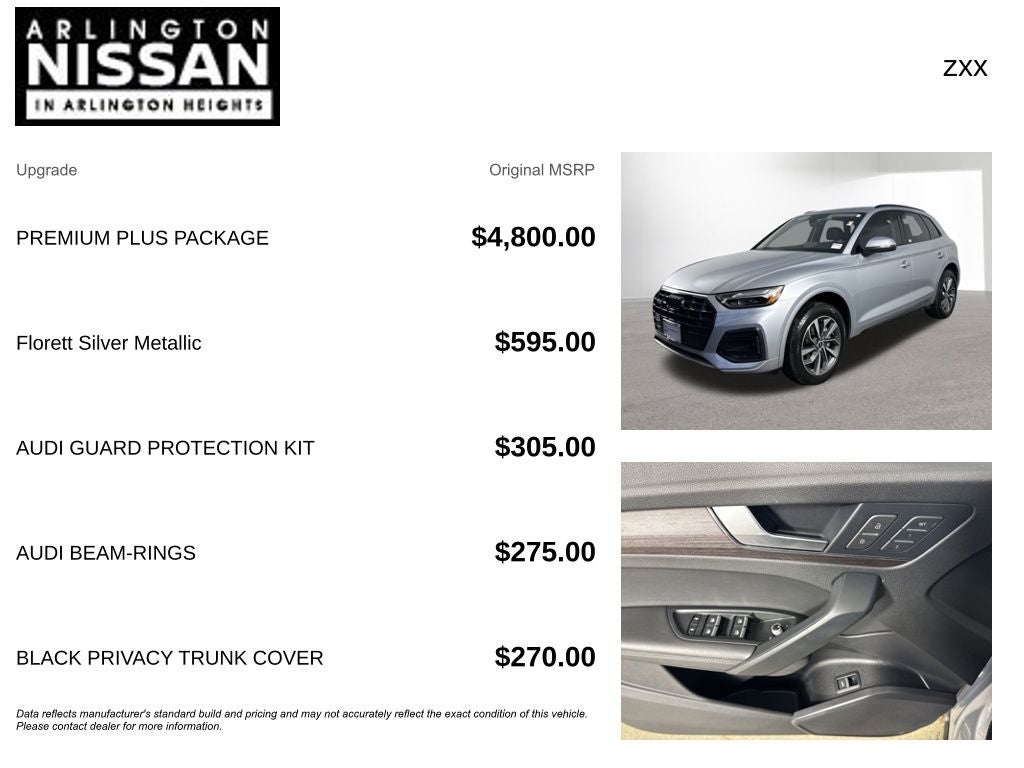 Exterior highlights include the Audi Beam-Rings, which project the iconic Audi logo onto the ground, and the AUDI GUARD PROTECTION KIT, which includes All-Weather Floor Mats and a Cargo Mat to keep your Q5 looking its best. The Black Privacy Trunk Cover adds a touch of sophistication and convenience.
