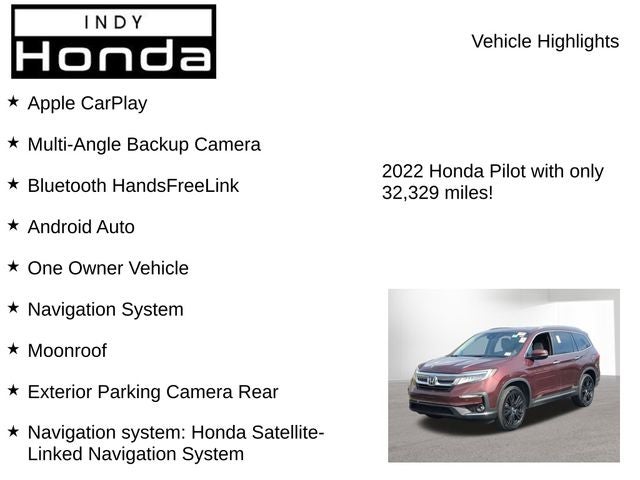 Backed by Honda's renowned reputation for quality and reliability, this 2022 Pilot Touring is a true standout in the midsize SUV segment. Experience the perfect blend of style, technology, and capability that this vehicle has to offer. Visit our showroom today and let us demonstrate how this Pilot can elevate your driving experience.