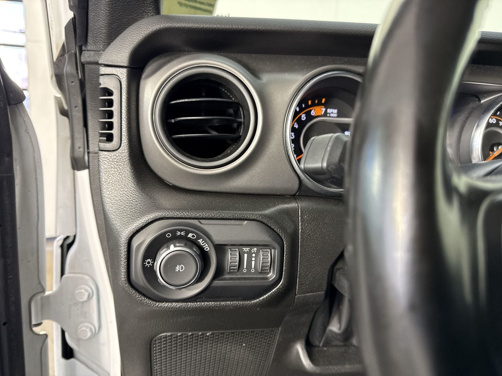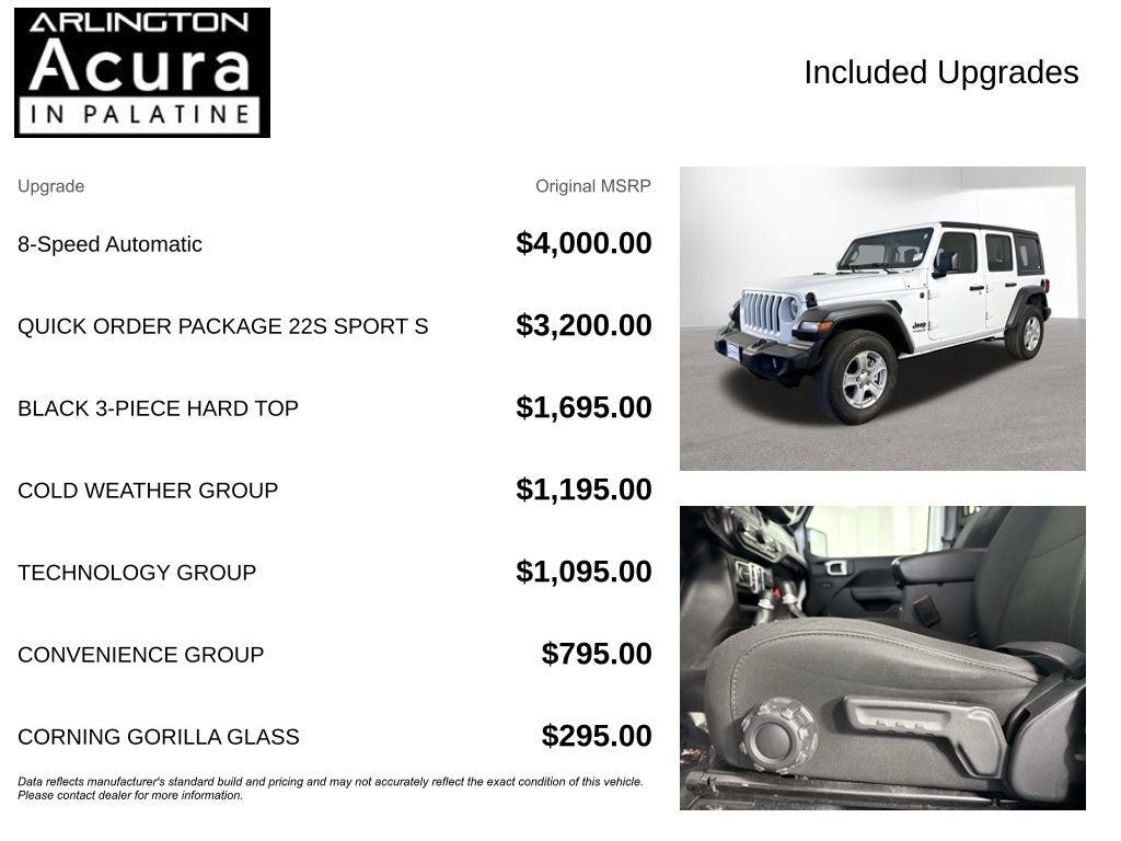 Wrangler Unlimited Sport S is nicely equipped with Cold Weather Group (Heated Front Seats and Heated Steering Wheel), Convenience Group, Quick Order Package 22S Sport S (Front 1-Touch Down Power Windows, Security Alarm, Speed Sensitive Power Locks, Sport S, Sun Visors w/Illuminated Vanity Mirrors, and Wheels: 17 x 7.5 Tech Silver Aluminum), Technology Group (2-Door Passive Entry, Front Door Locks and SiriusXM Satellite Radio), **Steering wheel mounted audio controls**, 110 MPH Vehicle Max Speed Calibration, 3.45 Rear Axle Ratio, 4-Wheel Disc Brakes, 8 Speakers, ABS brakes, Air Conditioning, AM/FM radio, Apple CarPlay/Android Auto, Aux Battery, Black 3-Piece Hard Top, Brake assist, Cloth Low-Back Bucket Seats, Compass, Corning Gorilla Glass, Delay-off headlights, Driver door bin, Driver vanity mirror, Dual front impact airbags, Dual front side impact airbags, Electronic Stability Control, Emergency communication system: SiriusXM Guardian, Engine Oil Cooler, Front anti-roll bar, Front Bucket Seats, Front Center Armrest w/Storage, Front fog lights, Front reading lights, Integrated roll-over protection, Low tire pressure warning, Non-Lock Fuel Cap w/o Discriminator, Normal Duty Suspension, Occupant sensing airbag, Outside temperature display, ParkView Rear Back-Up Camera, Passenger door bin, Passenger vanity mirror, Power steering, Radio data system, Radio: Uconnect 4 w/7 Display, Rear anti-roll bar, Rear reading lights, Rear Window Wiper/Washer, Speed control, Split folding rear seat, Stop-Start Dual Battery System, Tachometer, Telescoping steering wheel, Tilt steering wheel, Traction control, Trip computer, Variably intermittent wipers, and Wheels: 17 x 7.5 Black Steel Styled.