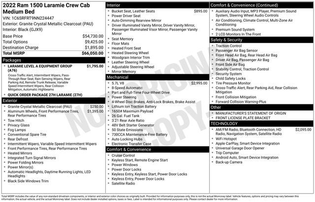 Designed to impress, the exterior of this 2022 Ram 1500 Laramie boasts a striking Granite Crystal Metallic Clearcoat finish and 20-inch premium painted and polished wheels that command attention on the road. The interior pampers you with luxurious leather-trimmed bucket seats, a heated steering wheel, and a full-length upgraded floor console for maximum comfort and convenience.